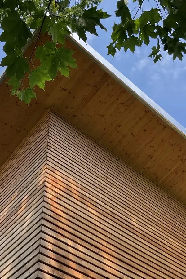 - Material der Wände, der Decke und des Daches aus Brettsperrholz.
